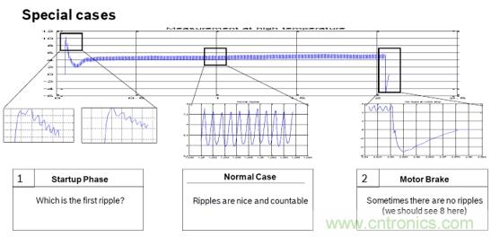 由于電機在啟動,停止,反轉,堵轉時的紋波特征不明顯。如圖5和圖6,不能精準的計數紋波個數。只能通過算法進行補償。這樣紋波計數必然和實際的必然存在誤差。而這誤差隨著車窗操作次數的增加,誤差也會跟著累積。