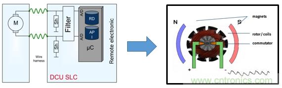 電機有磁極、轉子線圈、換向器組成。根據右手定律轉子線圈通電后再磁極磁場的作用下產生運動。運動到磁場邊緣是磁場變弱,電動勢減小,電流增大。換向器改變轉子線圈的電流方向,重新進入磁場電動勢增大,電流減小。轉子線圈不斷轉動、電動勢和電流不斷變化,從而紋波不斷產生。所以紋波是電機的固有特性,通過計算紋波的個數就能計算出轉子換向的次數,就能計算出窗戶的相對位置,結合時間就能得出電機的轉速。