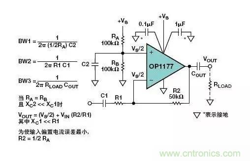 一種常用但不正確的方法是利用100 kΩ/100 kΩ電阻分壓器(加0.1μF旁路電容)提供VS/2給運算放大器的同相輸入端。使用這樣小的電容值對電源退耦通常是不夠的,因為極點僅為32 Hz。電路出現不穩定(“低頻振蕩”),特別是在驅動感性負載時。