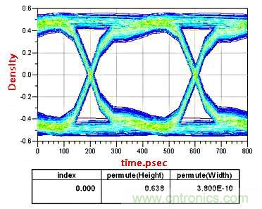 在低速電路設計中,這顆電容可以等效成理想電容。而在高頻電路中,由于寄生電感的存在以及板材造成的阻抗不連續性,實際上這顆電容不能看作是理想電容。這里信號頻率2.5G,通道長度4000mil,AC耦合電容的位置分別在距離發送端和接收端200mil的位置。我們看一下仿真出的眼圖的變化。
