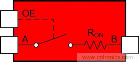 通過輸出使能引腳 (OE),用電壓來控制這個開關;只需在高電平關閉開關,在低電平時打開開關。(對于低電平有效OE引腳來說,恰恰相反;這些引腳上通常會有標簽進行標注。)RON 是開關的內部電阻。A和B到開關的兩個連接點。