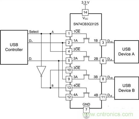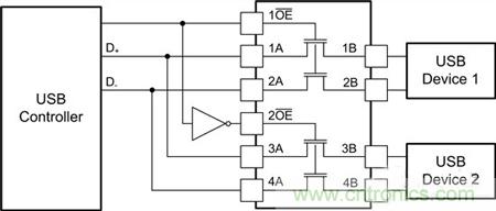 圖4:將2個USB器件復用至一個控制器時的SN74CB3Q3125接線