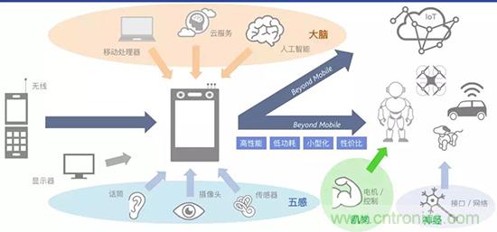 他指出按照這個原理疊加,如果再疊加人的肌肉----類似一些電機控制執行器件,就形成了機器人的概念,再把低功耗小型化智能運用就形成IOT物聯網概念,隨著技術的在進步,智慧手機會超越了手機行業的范疇,逐步進入到各個其他領域。如車載、機器人、穿戴設備,給其他周邊設備、周邊行業等,帶來革命性的產品形態變化。