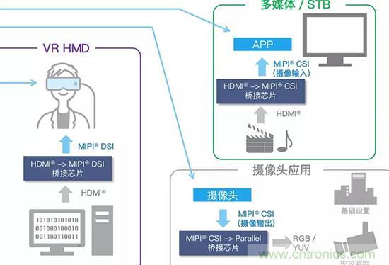 例如VR技術,VR是使用高清晰的小型顯示設備,其實這是從原來的智能手機顯示屏發展而來。智能手機主要使用MIPI等接口方式,但是VR是從PC轉變來的,它采用了大量高清晰度圖像。主要使用HDMI接口。隨著手機進入到VR領域,就會遇到接口不統一的挑戰。