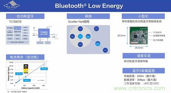 針對這樣的應用場景,東芝推出了整合了控制芯片的藍牙芯片,是迄今實現的功耗最低藍牙芯片,新的藍牙芯片可以實現組網,可應用到體積很小的設備上,且可以通過新版本,實現長達600米通信距離,最大電流是3.3毫安,一顆鈕扣電池可以使用3到4年。