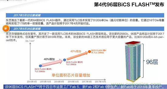 東芝電子(中國)有限公司副總經理野村尚司表示東芝在2017年已經推出了最新一代的64層BiCS FLASH器件,通過采用TLC技術實現了512Gb單Die(晶元切割單位)的容量。它通過16個Die堆疊 結構實現了1TB的單一封裝容量,該產品計劃于2017年4月開始付運。