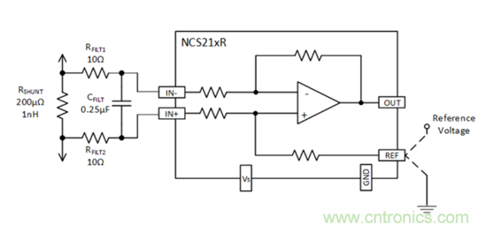 其他應(yīng)用,如DC-DC轉(zhuǎn)換器和電源應(yīng)用也可能需要在電流檢測放大器的輸入端進(jìn)行濾波。圖1所示為建議的輸入濾波原理圖。