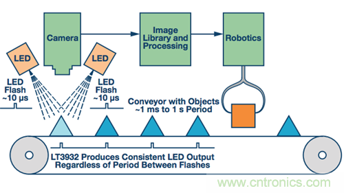 幸運(yùn)的是,LT3932高速LED驅(qū)動(dòng)器可為高達(dá)2 A的LED串提供機(jī)器視覺相機(jī)閃光燈,關(guān)斷時(shí)間可以長(zhǎng)達(dá)1秒、1小時(shí)、1天或更長(zhǎng)時(shí)間。LT3932的特殊相機(jī)閃光燈功能允許其保持輸出電容和控制環(huán)路充電狀態(tài),哪怕是在長(zhǎng)關(guān)斷時(shí)間內(nèi)。對(duì)輸出和控制環(huán)路電容的狀態(tài)進(jìn)行采樣后,LT3932繼續(xù)在長(zhǎng)關(guān)斷期間對(duì)這些元件進(jìn)行涓流充電,以補(bǔ)償通常都會(huì)有的漏電流,而這是其他LED驅(qū)動(dòng)器未予考慮的。