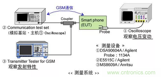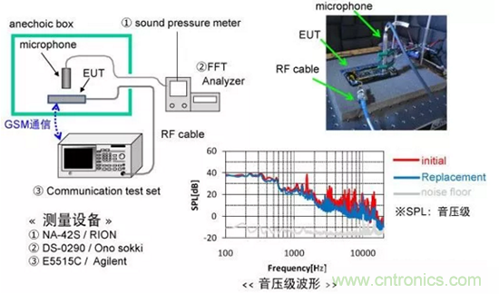 本次置換評估中,對GSM通信時的①發射特性、②蓄電池的電壓變動和③嘯叫進行評估。