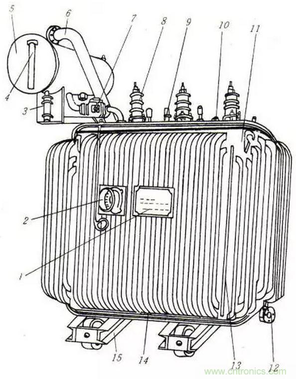 1-銘牌;2-信號式溫度計;3-吸濕器;4-油標;5-儲油柜;6-安全氣道;7-氣體繼電器;8-高壓套管;9-低壓套管;10-分接開關;11-油箱;12-放油閥門;13-器身;14-接地板;15-小車;16壓力釋放閥(補充:圖左上側)