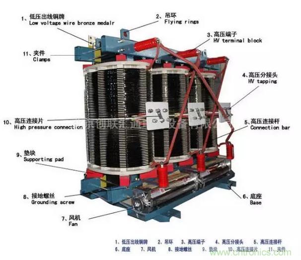 鐵芯和繞組是變壓器中最主要的部件,構成了變壓器的器身。主要介紹三相油浸式電力變壓器和環氧樹脂澆注絕緣的三相干式電力變壓器的結構。