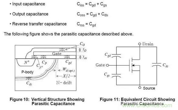 將漏源短接,用交流信號測得的柵極和源極之間的電容就是輸入電容。Ciss是由柵漏電容Cgd和柵源電容Cgs并聯而成,或者Ciss = Cgs +Cgd。當輸入電容充電致閾值電壓時器件才能開啟,放電致一定值時器件才可以關斷。因此驅動電路和Ciss對器件的開啟和關斷延時有著直接的影響。