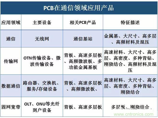 在通信領域的應用占比由2009年的22%提升至2017年的27%,PCB在通信領域的應用呈穩步上升趨勢,主要運用于手機、光模塊、濾波器、通訊背板、通訊基站天線等設備中;