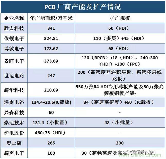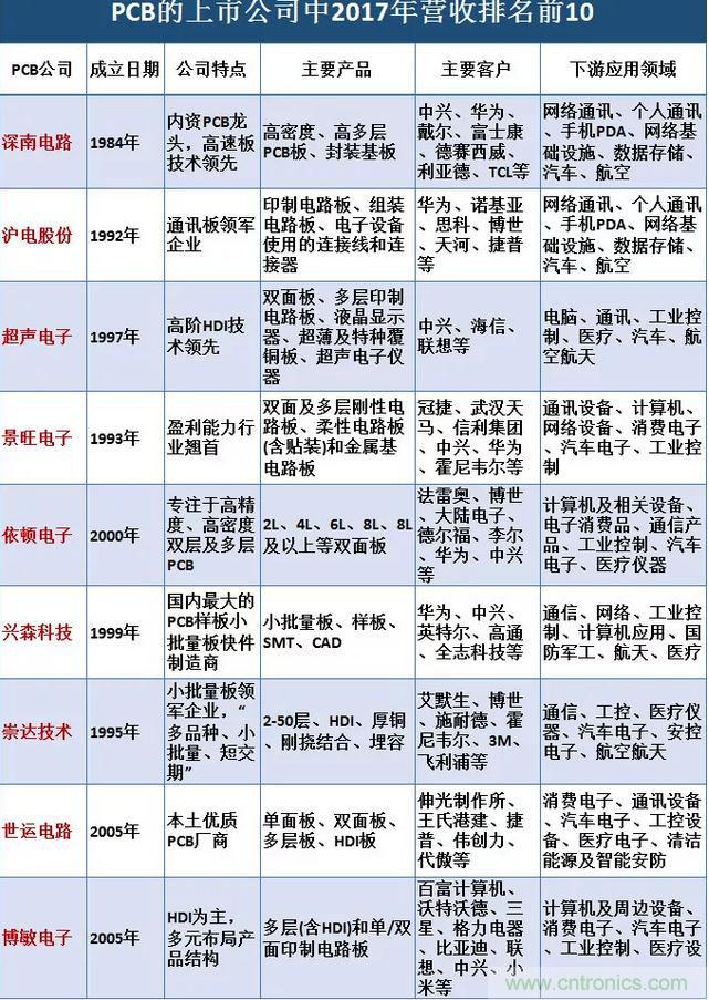 超聲電子:成立于1997年,高階HDI技術領先。產品包含雙面及多層印制電路板、液晶顯示器、超薄及特種覆銅板、超聲電子儀器等,是蘋果、博世、法雷奧等全球知名企業長期供應商。PCB為主要營收來源,2017年營收占比53%。