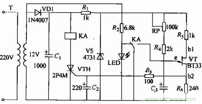 電容G上電壓按指數(shù)規(guī)律逐漸升高,當(dāng)此電壓大于單結(jié)晶體管VT的峰點電壓時,單結(jié)晶體管導(dǎo)通,G經(jīng)VT的eb1極和風(fēng)放電,在風(fēng)上輸出脈沖電壓,觸發(fā)藩閘管VTH導(dǎo)通使繼電器KA吸合,KA的觸頭同時將C3短路,使之迅速放電,單結(jié)晶體管的ebl之間電壓迅速下降,當(dāng)降到Vr.的谷點電壓時,Vr關(guān)閉。同時LED指示燈點亮。當(dāng)切斷電源時,繼電器KA釋放,電路恢復(fù)原始狀態(tài),等待下次動作。通過調(diào)節(jié)RP.可以調(diào)整延時時間。