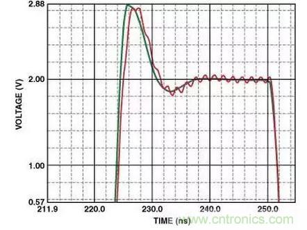 圖7中的振蕩示出了高速運算放大器同相輸入端長度為2.54 cm的印制線的影響。其等效寄生電感為29 nH(10-9H),足以造成持續的低壓振蕩,會持續到整個瞬態響應周期。圖7還示出了如何利用接地平面來減小寄生電感的影響。