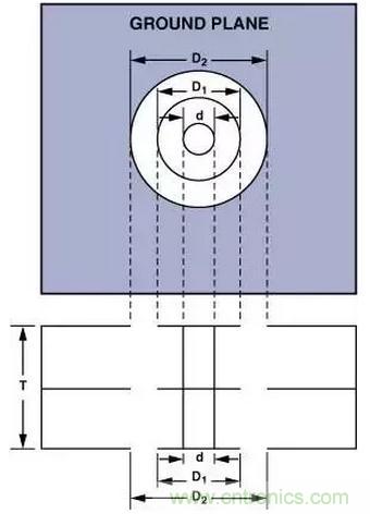 εr表示PCB材料的相對磁導率。T表示PCB的厚度。D1表示環繞通孔的焊盤直徑。D2表示接地平面中隔離孔的直徑。所有尺寸均以cm為單位。在一塊0.157 cm厚的PCB上一個通孔就可以增加1.2 nH的寄生電感和0.5 pF的寄生電容;這就是為什么在給PCB布線時一定要時刻保持戒備的原因,要將寄生效應的影響降至最小。
