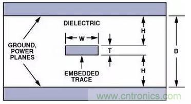 H表示從接地平面到信號印制線之間的距離,W表示印制線寬度,T表示印制線厚度;全部尺寸均以密耳(mils)(10-3英寸)為單位。εr表示PCB材料的介電常數。