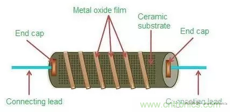 與金屬膜電阻結構類似,金屬氧化物膜主要是在陶瓷棒形成一層錫氧化物膜,為了增加電阻,可以在錫氧化物膜上加一層銻氧化物膜,然后在氧化物膜上加工出螺旋溝槽來精確控制電阻。金屬氧化物膜電阻最大的優勢就是耐高溫。