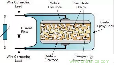 壓敏電阻通常都是金屬氧化物可變電阻,即Metal Oxide Varistor(MOV),其電阻材料是氧化鋅顆粒和陶瓷顆?;旌虾笠黄馃Y成型。MOV的特性就是當電壓超過一定閾值的時候,電阻迅速下降,可以通過大電流,因此可以用于浪涌防護和過壓保護。