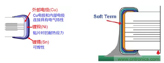 陶瓷電容主要由兩部分組成,陶瓷電容本體和外部電極組成。本體部分由內部電極和介質層組成,外部電極由銅鎳錫三層組成,柔性電容會在銅鎳之間多加一層Soft Term層,增加可靠性。