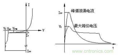 圖中曲線1是TVS管中的電流波形,它表示流過TVS管的電流由1mA突然上升到峰值,然后按指數(shù)規(guī)律下降,造成這種電流沖擊的原因可能是雷擊、過壓等。曲線2是TVS管兩端電壓的波形,它表示TVS中的電流突然上升時,TVS兩端電壓也隨之上升,但最大只上升到VC值,這個值比擊穿電壓VBR略大,從而對后面的電路元件起到保護作用。