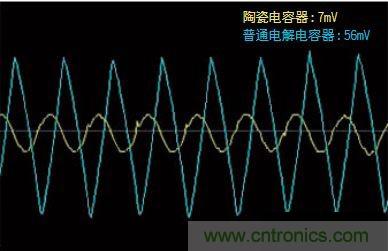 將DC-DC轉(zhuǎn)換器的輸出電容器由鉭電解電容器換成片狀多層陶瓷電容器時(shí)的輸出電壓波形。DC-DC轉(zhuǎn)換器的開(kāi)關(guān)頻率為300MHz。鉭電解電容器的容量為100μF。使用3 個(gè) 22μF的片狀多層陶瓷電容器產(chǎn)品。替換前的紋波電壓為56mV,更換成片狀多層陶瓷電容器后降到了7mV。