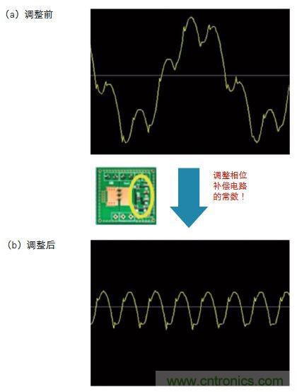 詳情請(qǐng)參見(jiàn)圖2。圖2(a)是單純把構(gòu)成DC-DC轉(zhuǎn)換器輸出平滑電路的電容器由鉭電解電容器更換成片狀多層陶瓷電容器后的輸出電壓波形。波形出現(xiàn)了異常振蕩,DC-DC轉(zhuǎn)換器的輸出電壓也隨之大幅變化。圖2(b)是對(duì)反饋環(huán)路相位補(bǔ)償電路的常數(shù)進(jìn)行調(diào)整后的波形。波形的異常振蕩得到了抑制,輸出電壓降到了不會(huì)產(chǎn)生負(fù)面影響的水平。實(shí)際使用中如果達(dá)到了這種輸出電壓波形,就可放心使用。