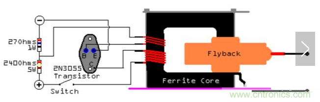 我們可以采用單管自激推高壓包的方法來(lái)產(chǎn)生高壓。我們使用一個(gè)2N3055三極管。