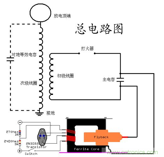 SGTC的原理就是先給電容充電,電容的電壓達(dá)到一定程度時(shí),在打火器出放出電弧,形成一個(gè)回路,然后放電,之后重新開(kāi)始這個(gè)循環(huán)。