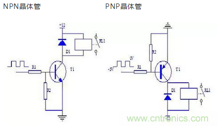 NPN晶體管驅動時:當晶體管T1基極被輸入高電平時,晶體管飽和導通,集電極變為低電平,因此繼電器線圈通電,觸點RL1吸合。