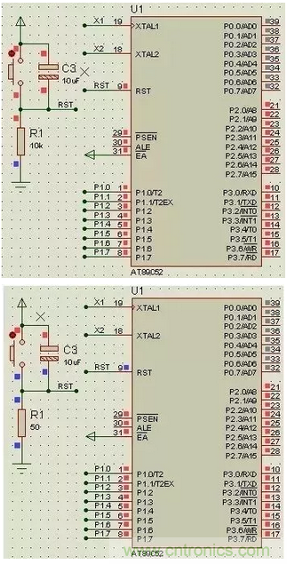 大家可以看到復位電路中電阻R1=10k時RST是高電平 ,而當R1=50時RST為低電平,很明顯R1=10k時是錯誤的,單片機一直處在復位狀態時根本無法工作。出現這樣的原因是由于RST引腳內含三極管,即便在截止狀態時也會有少量截止電流,當R取的非常大時,微弱的截止電流通過就產生了高電平。