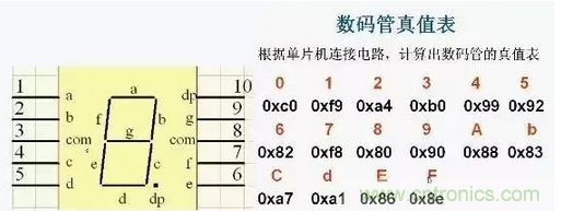 數碼管點亮形成的數字由a,b,c,d,e,f,e,dp(小數點)構成,字模及真值表如上圖。