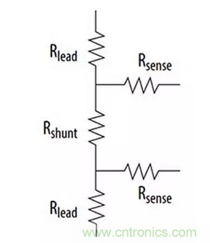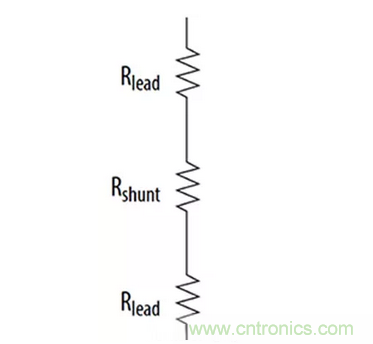 分流電阻器并不像其外表看起來那么簡單。具體而言,分流電阻器的電阻實(shí)際上由三個(gè)電阻組成(圖2)。首先,分流電阻器本身有電阻。其次,分流電阻器引線和分流電阻器連接的印刷電路板上的引線也有電阻。通常這些引線電阻不明顯,但是分流電阻器的電阻值通常非常低。在高電流測(cè)量中,即使很小的引線電阻也會(huì)引入測(cè)量誤差,因?yàn)橹圃焐痰姆至麟娮杵麟娮枰?guī)格中并未考慮這些電阻。