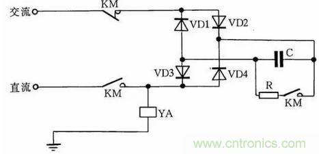 快速退磁的工作原理是:直流電磁鐵斷電后,交流電源通過橋式整流器和YA向電容C充電,隨著電容C兩端電壓的不斷升高,充電電流越來越小,而通過YA的電流又是交變的,從而使電磁鐵快速退磁。電容C的容量要根據電磁鐵的實際情況現場試驗決定。R為放電電阻。