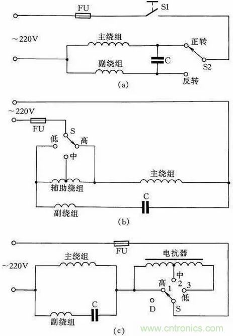 圖16(b)為帶輔助繞組的接線線路,撥動開關S,可改變輔助繞組的抽頭,即改變主繞組的實際承受電壓,從而改變電動機的轉速,此接線方法常用于電風扇上。