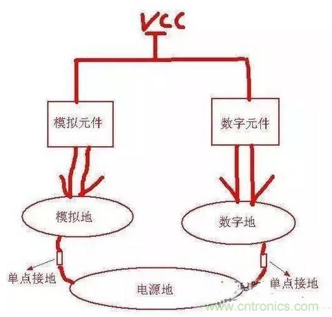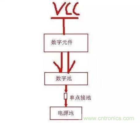 從此圖可以看出:只在電源地和數字地之間用一個0歐電阻或磁珠之類的單點接地就行了,同樣單點接地的位置應該盡量靠近板子電源地的入口(起始位置)。