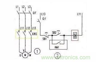 上圖是用接觸器控制電機的原理圖,圖1是主回路,圖2是控制回路,圖中黃色框內就是接觸器的主觸點,藍色框內是接觸器的輔助觸點,紅色框內是接觸器的線圈。SB2是起動按鈕,SB1是停止按鈕,當按下SB2時KM1線圈得電吸合,同時藍色框內的KM1輔助觸點也閉合,松開SB2電機照常轉動,按下SB1時電機停止。下圖時交流接觸器接線圖,可以與上圖對照一下。