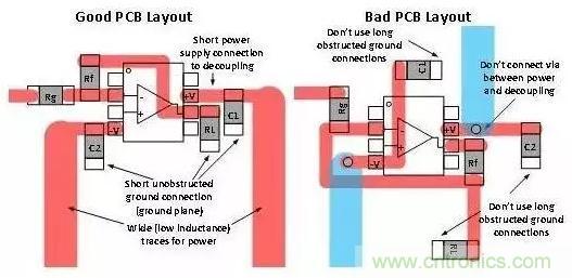 除了使用去耦電容器外,您還要在去耦電容器、電源和接地端之間采取較短的低阻抗連接。圖3將良好的去耦合板面布局與糟糕的布局進行了對比。您應始終嘗試著讓去耦合連接保持較短的距離,同時避免在去耦合路徑中出現通孔,原因是通孔會增加電感。大部分產品說明書都會給出去耦合電容器的推薦值。如果沒有給出,則可以使用0.1uF。