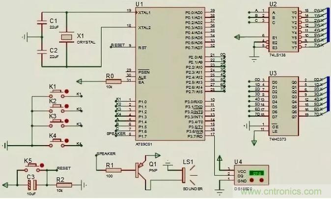 使用單片機的P2口進行數模的輸出,P1^4、P1^5、P1^6與74HC138連接實現數碼管位選,按鍵電路接入P1^0、P1^1、P1^2、P1^3四個IO口,通過程序控制,掃描該四個引腳的信號實現時間的調節。蜂鳴器通過與三極管8550連接,最終接入P1^7,時間設定啟動使其發聲。溫度傳感器接入P3^7,將采集到的模擬信號轉化為數字信號后傳到單片機。