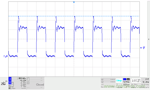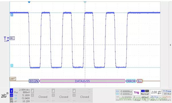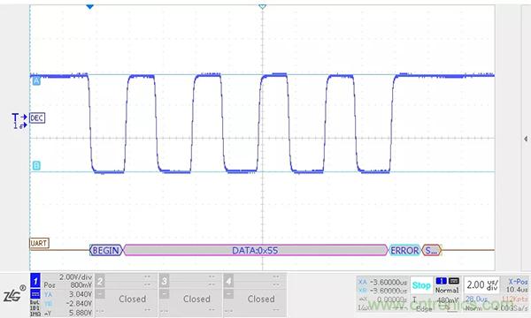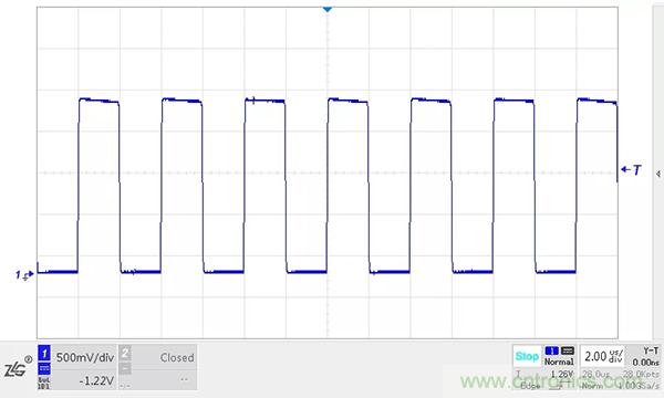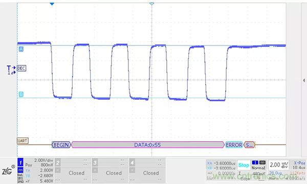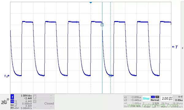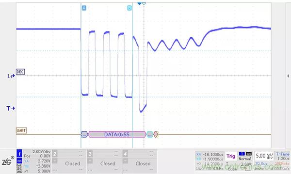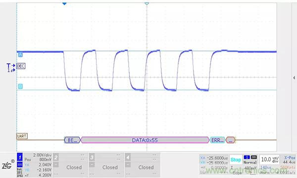 在顯性狀態(tài)期間,總線的寄生電容會(huì)被充電,而在恢復(fù)到隱性狀態(tài)時(shí),這些電容需要放電。如果CANH、CANL之間沒有放置任何阻性負(fù)載,電容只能通過收發(fā)器內(nèi)部的差分電阻放電。我們?cè)谑瞻l(fā)器的CANH、CANL之間加入一個(gè)220PF的電容進(jìn)行模擬試驗(yàn),位速率為500kbit/s,波形如下圖所示。