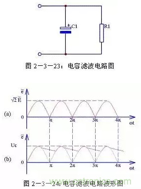 電容濾波電路圖見圖2-3-23,電容濾波電路是利用電容的充放電原理達到濾波的作用。在脈動直流波形的上升段,電容C1充電,由于充電時間常數很小,所以充電速度很快;在脈動直流波形的下降段,電容C1放電,由于放電時間常數很大,所以放電速度很慢。在C1還沒有完全放電時再次開始進行充電。這樣通過電容C1的反復充放電實現了濾波作用。濾波電容C1兩端的電壓波形見圖2-3-24(b)。