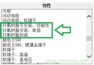 此外,有兩種選擇這些環氧樹脂安裝電容,或者過濾掉它們。若只選擇環氧樹脂安裝選項,請在"特性"選項中選擇環氧樹脂,如下圖所示: