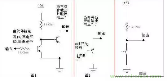 圖3中那個1k的電阻即是上拉電阻。如果開關閉合,則有電流從1k電阻及開關上流過,但由于開關閉和時電阻為0(方便我們的討論,實際情況中開關電阻不為0,另外對于三極管還存在飽和壓降),所以在開關上的電壓為0,即輸出電平為0。如果開關斷開,則由于開關電阻為無窮大(同上,不考慮實際中的漏電流),所以流過的電流為0,因此在1k電阻上的壓降也為0,所以輸出端的電壓就是5v了,這樣就能輸出高電平了。