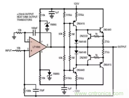 圖1:為了提升運算放大器的電壓輸出,一種方法是為Analog Devices的LT1055等基本器件加裝補償升壓晶體管,來利用運算放大器的輸入特性;這種設(shè)計可輸出±120V電壓。(圖片來源:Analog Devices)