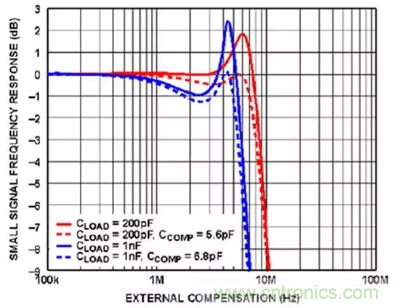 圖4:在單位增益、±110V供電電壓、VOUT = 100Vp-p、Rf = 0Ω 及 CCOMP = 5.6皮法 (pF) 時,ADHV4702-1的小信號頻率響應(yīng)與外部補償?shù)年P(guān)系曲線圖。(圖片來源:Analog Devices)
