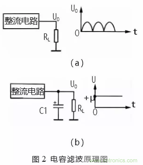 圖2(a)為整流電路的輸出電路。交流電壓經整流電路之后輸出的是單向脈動性直流電,即電路中的 UO。