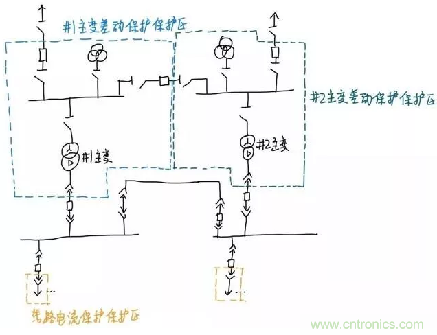 然后是變壓器連接的高壓母線。這條母線是分段的,我們希望哪段母線發生故障就只切這段母線而不切另一段,所以每段母線都需要一個單獨的保護區。按照上文的分區原則,我們可以很容易地確定出高壓母線和輸電線路的保護區,如下圖: