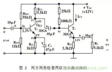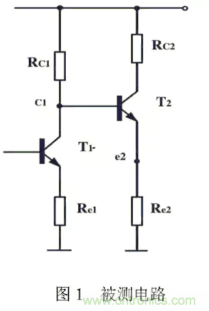 用同一臺測量儀器進行測量時,測量點不同,儀器內阻引進的誤差大小將不同。例如,對于圖1所示電路,測C1點電壓VC1時,若選擇e2為測量點,測得VE2,根據VCl=VE2+VBE2求得的結果,可能比直接測Cl點得到的VC1的誤差要小得多。所以,出現這種情況,是因為Re2較小,儀器內阻引進的測量誤差小。