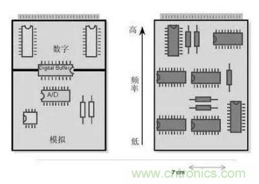 圖4 (左)將數(shù)字開關動作和模擬電路隔離,將電路的數(shù)字和模擬部分分開。(右)要盡可能將高頻和低頻分開,高頻元件要靠近電路板的接插件。